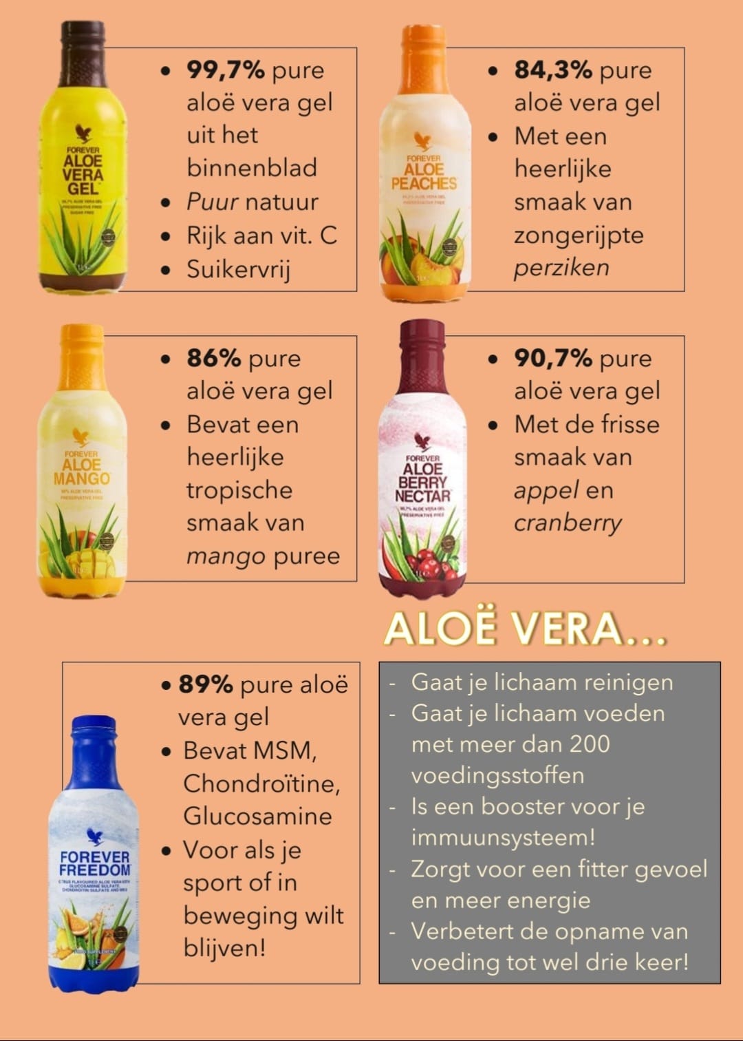 Naast uitwendig gebruik wordt aloë vera ook in drank en supplementen verwerkt. Wij verkopen de hoogste percentage Aloë vera drank. De ervaring is dat het je lichaam reinigt, hersteld en in balans brengt. Je voelt je na een tijdje fitter, energieker.